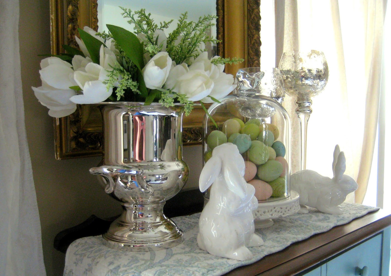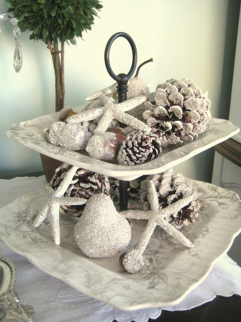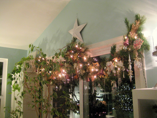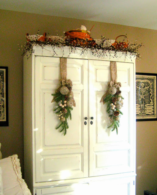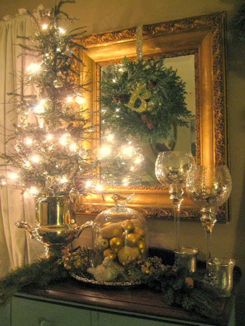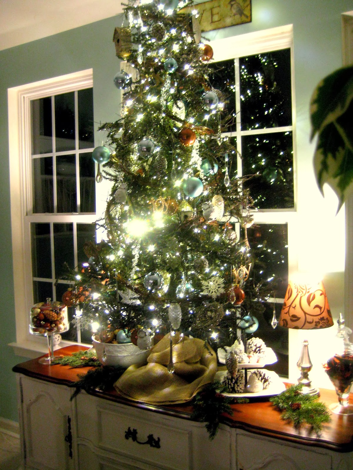 Some of what I am doing this year is a repeat of last year, like the dresser above, other things I am tweaking. I decided to put my dining room tree on top of the server in front of the windows. It's a little more dramatic than last year when I had it in the corner. The details are not clear in the photo, but it has a nature theme, a twiggy tree wrapped in grapevines, and decorated with birds nests, glass pinecones, little bird houses, owls, icicles, as well as some blue and brown balls. I wrapped the base in burlap and added some greens.