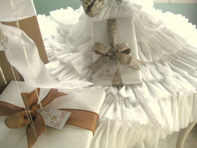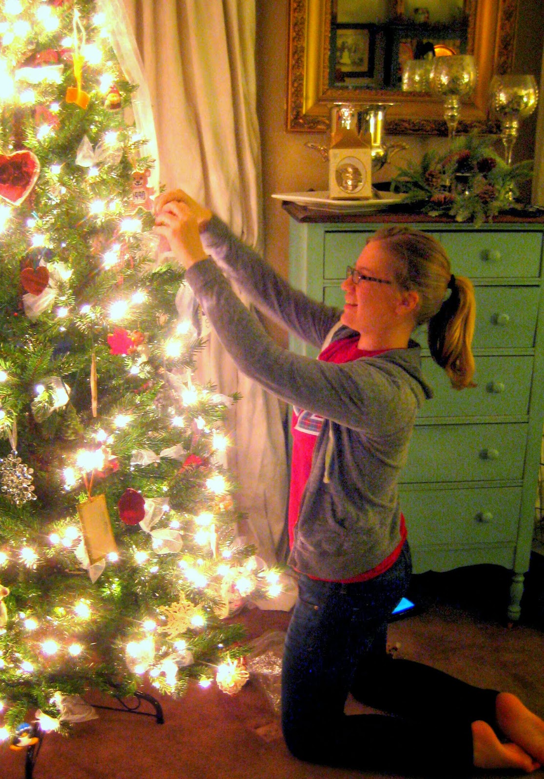 My kids were home briefly at Thanksgiving and decorated the living room tree, which is always our family ornaments; things that the kids and I made over the years, things my mom made and gave to us, sentimental ornaments sent to us by special friends and family. One thing I changed was that I didn't use my red wooden bead garland, or the red skirt. I decided instead to tie squares of white tulle to the tree branches and to use my white ruffled tree skirt.