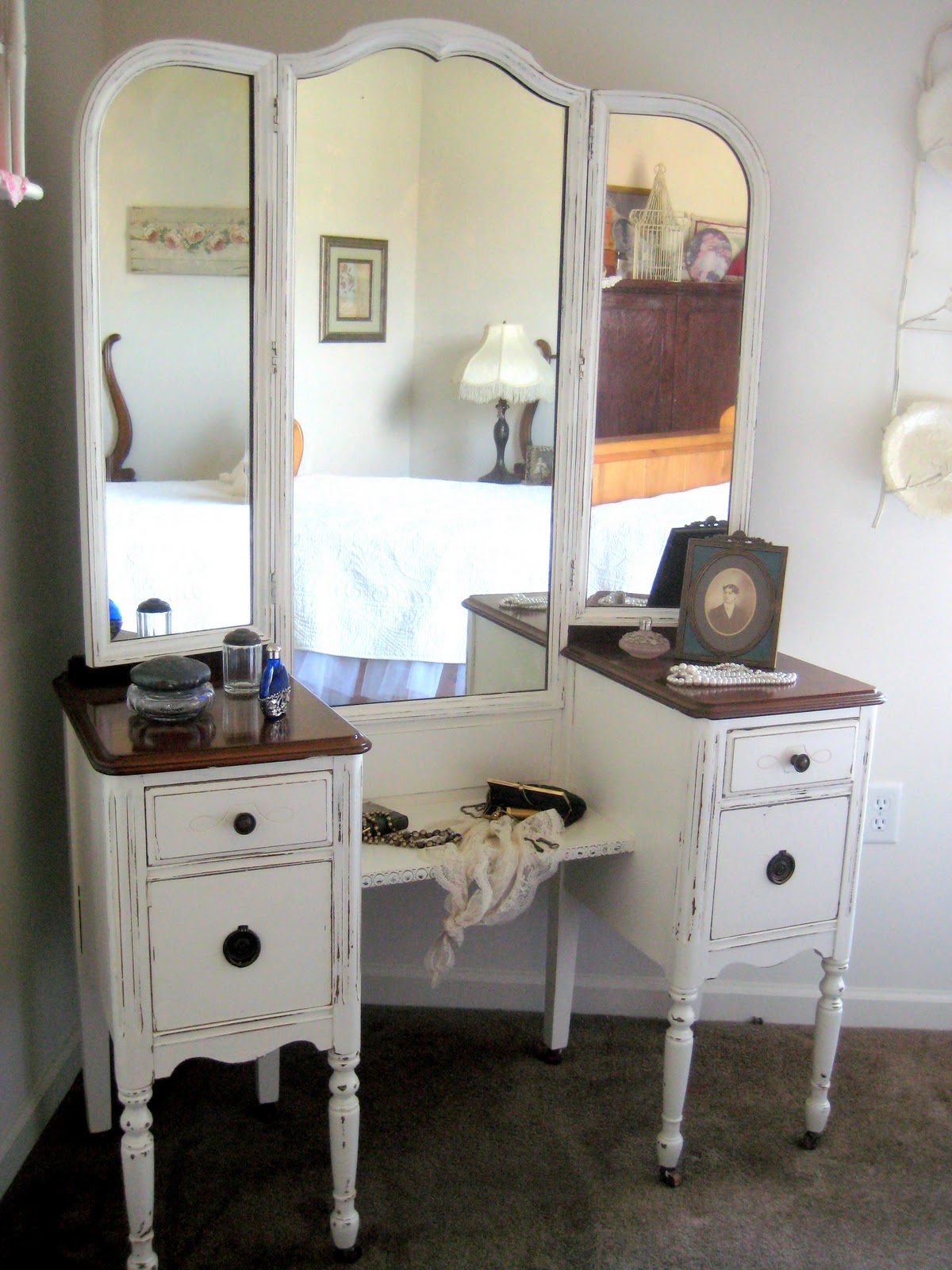 I have shown you my vanity before. It came to be mine when my ex spotted it for sale for $50 in someone's yard and bought it for me about 15 years ago. I've always loved its trifold mirror, graceful lines and curvy legs. Not so much the dull finish and chipped veneer, but it's something I use every day and like many things, after a while I stopped noticing.